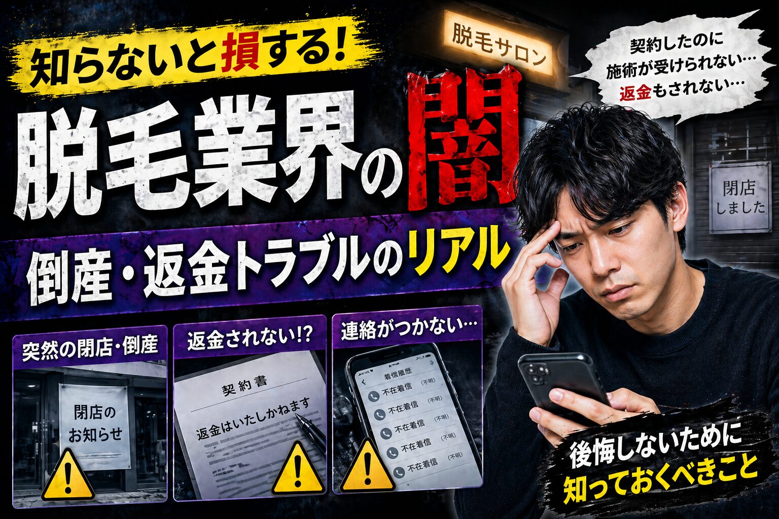 こんな方におすすめ 高額コースを勧められて迷っている人 安い脱毛キャンペーンに惹かれている人 倒産や返金トラブルが不安な人 脱毛は以前よりもかなり身近なものになりました。女性だけでなく男性も気軽に通う時代になり、ヒゲ脱毛や全身脱毛、VIO脱毛などに興味を持つ人は年々増えています。広告も増え、月額制や通い放題、今だけ半額など、お得感を前面に出したサービスも多く見かけるようになりました。 しかし、その一方で、表には出にくい問題もあります。それが倒産や返金トラブルです。契約した直後は順調に通えていたのに、ある日 ...